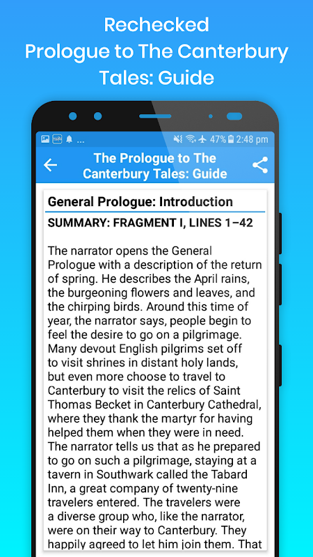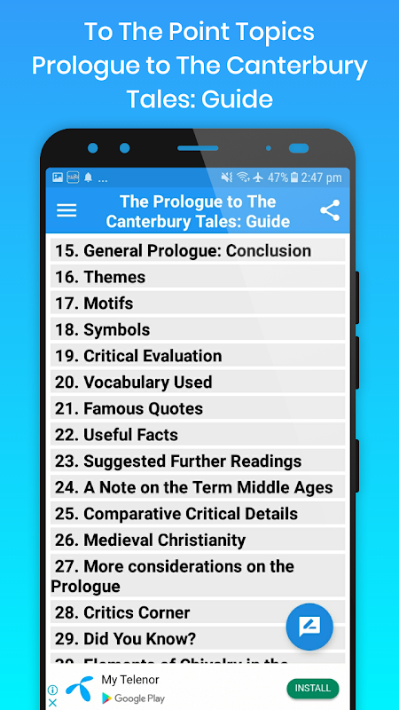 This Guide app works both online and offline, and contains 38 basic topics about one of the famous poem of Geoffrey Chaucer, The Prologue to The Canterbury Tales.
