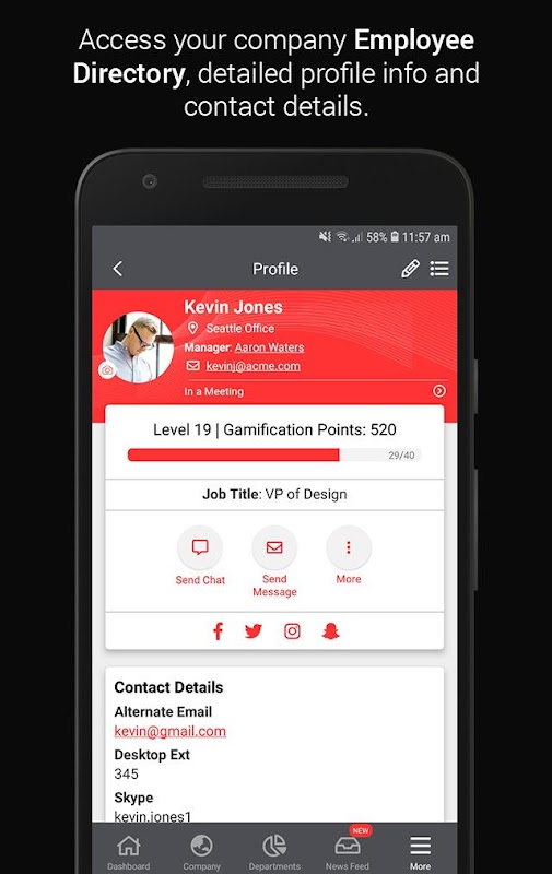 like company directory, search, polls, virtual accolades, office pokes, and birthday gifts, to promote company-wide interaction and collaboration.