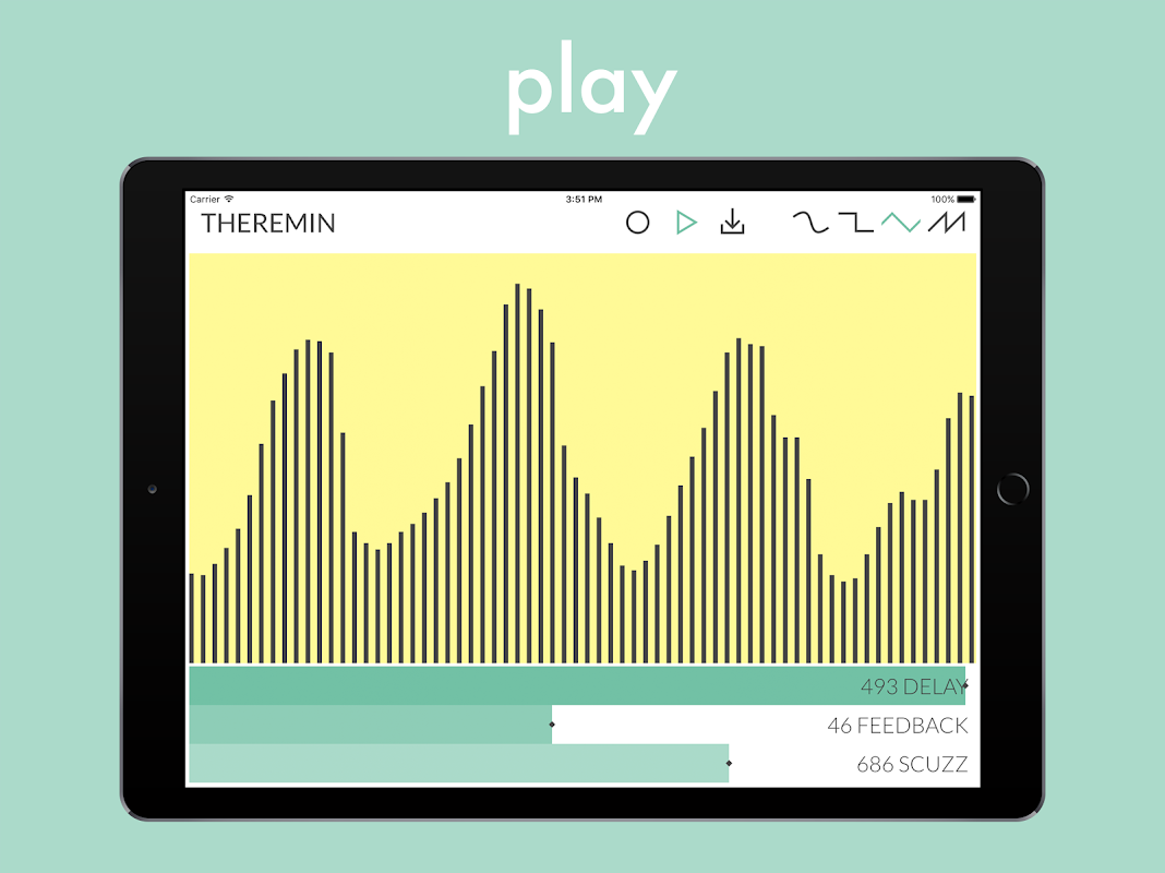 이것은 멀티 터치 신디사이저 악기입니다. 터치 화면을 스 와이프, 파형을 변경하고 기존의 공상 과학 테레 민에서 아무것도를 만드는 데 영향을 밀어 플레이 깊은 scuzzy 사운드 스케이프에 소리가 난다. 기록, 루프 오버 더빙 층에 루퍼 컨트롤을 사용합니다. 저장하거나 기록을 공유하려면 다음, 메시지, 이메일, 드롭 박스 등 같은 다른 호환 애플 리케이션에 wav 파일을 보낼 수있는 다운로드 버튼을 누르면