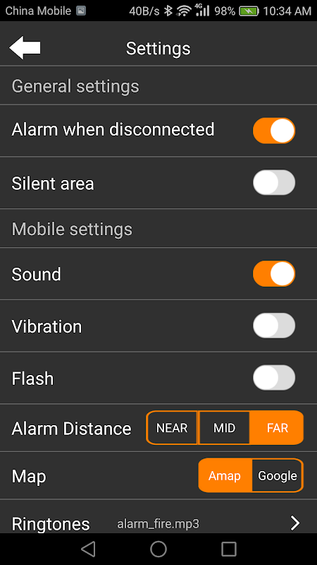 기본적으로, 말하기 thetrackey가 범위를 벗어나면, 응용 프로그램은 사운드, 진동 및 플래시 당신을 알려줍니다. 알람은 키 찾기, 전화, 또는 두 가지 모두에 설정할 수 있습니다.