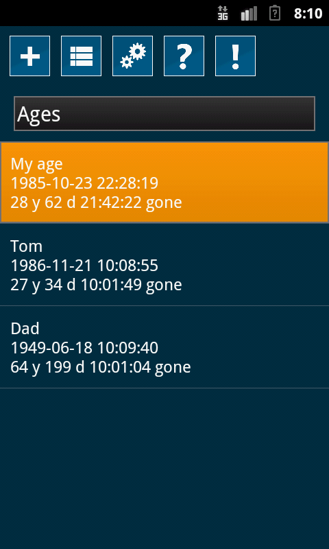 나이, 이벤트를 기억하고 얼마나 많은 시간이 남아있는 또는 그 순간 사라 졌 보려면이 응용 프로그램을 사용합니다.