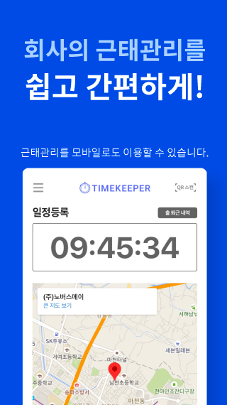 타임키퍼는 방송통신위원회로 부터 인증받은 앱으로써 모바일 앱으로 출퇴근 관리 및 외근지 정보를 관리 할 수 있습니다.