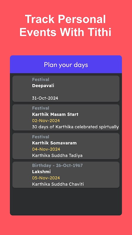 티티 트래커는 힌두력에 따라 생일과 기념일에 친구와 가족을 맞이하는 데 도움을 주고, 조상과 신을 기리는 중요한 의식 날짜를 알려줍니다.