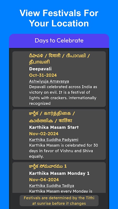 티티 트래커는 힌두 전통과 문화 의식을 소중히 여기는 분들에게 완벽한 동반자입니다. 이 힌두 달력 앱은 매일 티티, 별, 다가오는 축제, 그리고 중요한 길일을 내 위치에 맞춰 업데이트해 줍니다.
