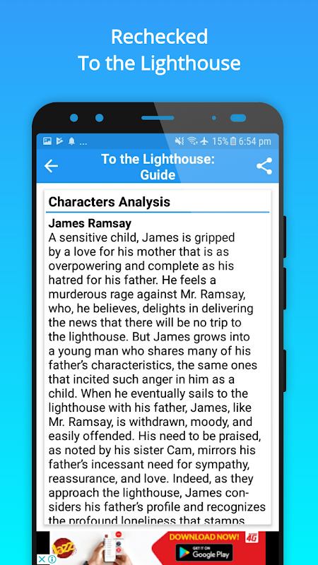 This Guide app works both online and offline, and contains 32 basic topics about one of the famous novels of Virginia Woolf, To the Lighthouse.
