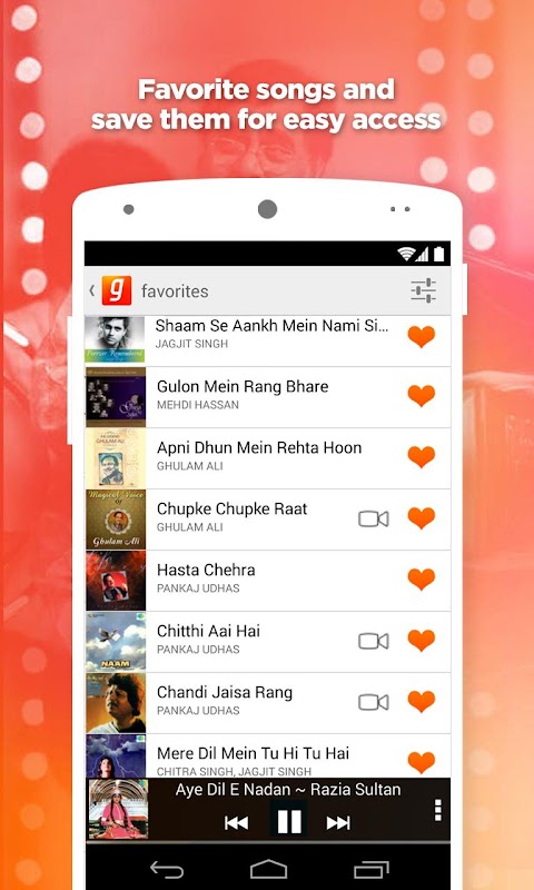 Brought to you by India’s largest online music broadcasting service - gaana.com, this app helps you listen to the best Ghazals of all times and watch their videos, anywhere, anytime on your mobile phone absolutely FREE! Now with this app, there is no need to download any mp3 songs, simply click and listen to the melodious Ghazals