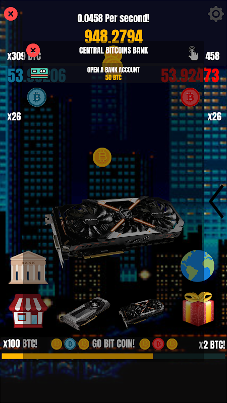 Кликайте на видеокарту что-бы получать биткоины. За эти биткоины прокачивайте ферму с помощью улучшений. Накапливайте все больше и больше биткоинов и становитесь миллионером!