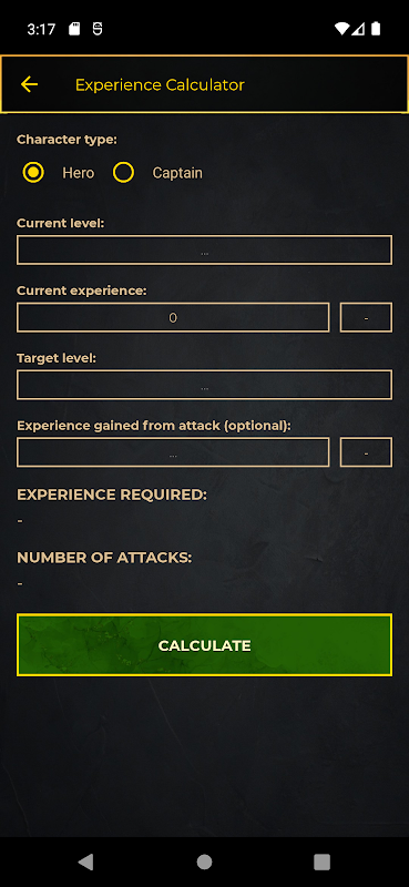 영웅 또는 대장의 레벨업에 필요한 경험치와 선택한 레벨에 도달하는 데 필요한 공격 횟수를 계산합니다.