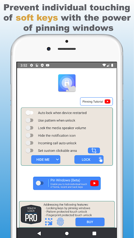 NOTE: The application functionality Pin Windows is not compatible with other apps(e.g. Youtube) that are using Picture-in-Picture functionality when this option is turned ON in Android Settings. You can make it compatible with Touch Lock by disable Picture-in-Picture individually for application you want to lock and use Pin Windows option. Pin Windows will make the user unable to leave the app even the Home or Recents buttons are pressed.