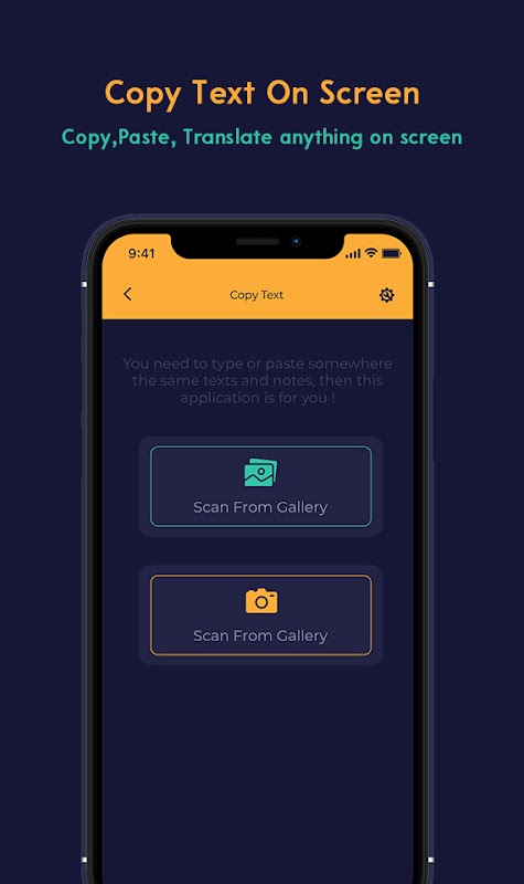 copy the text on the screen은 이미지나 휴대폰 화면에서 모든 텍스트를 쉽게 복사할 수 있는 완벽한 앱입니다. Universal Copy All 앱에 텍스트를 한 번 추가하고 다시 입력하지 않고 필요할 때마다 클립보드에 복사할 수 있습니다. 화면에서 텍스트 복사는 이미지에서 모든 텍스트를 복사하고 추출하는 쉬운 솔루션입니다. 카메라를 열거나 갤러리에서 사진을 선택하여 모든 텍스트를 복사합니다.