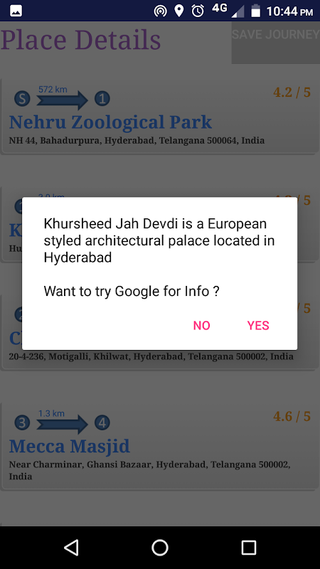 TravelAssist(TA) app simplifies the traveller to find the tourist places(top 20) of an unknown city just by entering the city name and also gives the direction from the start place chosen by the user and gives the place details and also can save the place details so it can also be seen when offline and can also delete the saved Journey data.Swipe the journey data to left to delete