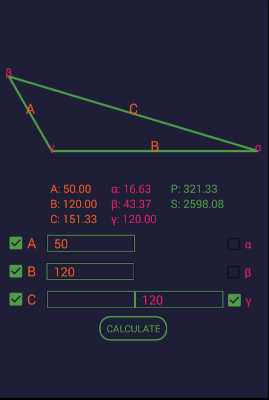 A simple application for calculating the angles and sides of an equilateral, equilateral, right triangle on existing sides and corners, as well as calculating the area and perimeter with a clear graphic display!