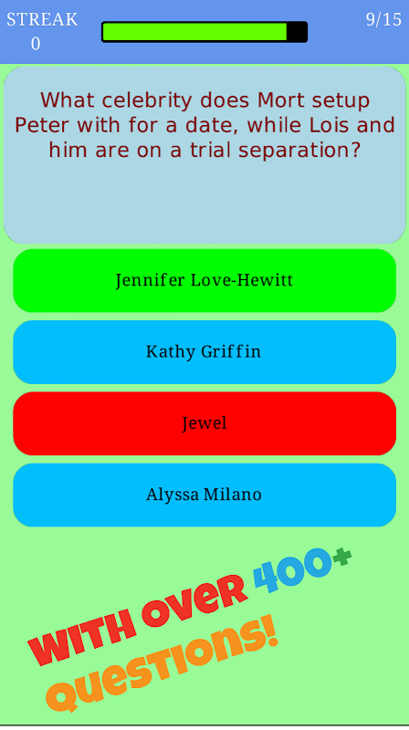 -With over 400+ questions and random difficulty levels, Trivia for Family Guy Fan Quiz is the latest trivia app on the store that brings up and tests your memory for the super loved Family Guy TV show.