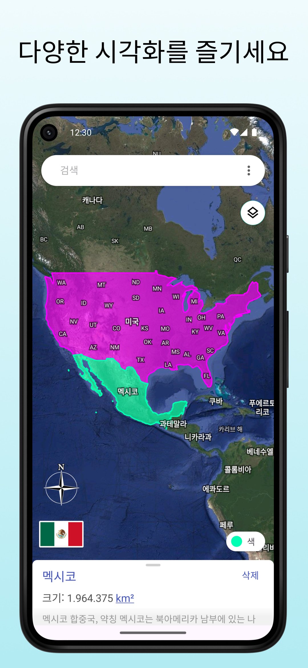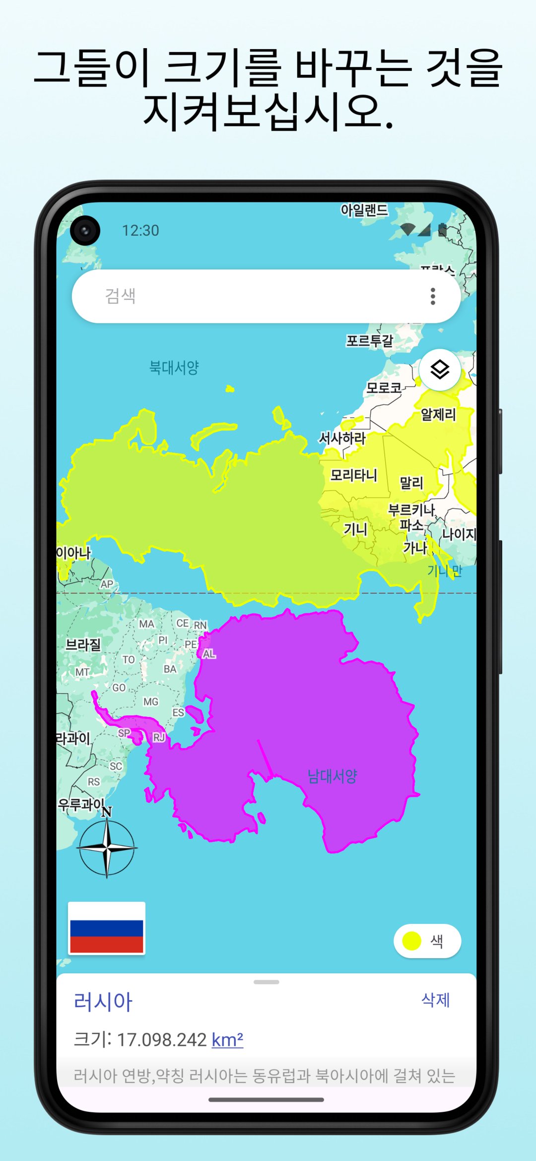 탐험하고 싶은 국가를 검색하거나 길게 탭하기만 하면 됩니다. 그런 다음 지도를 이동하며 적도에 가까워지거나 멀어질수록 크기가 어떻게 변하는지 볼 수 있습니다.