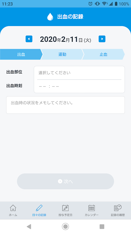 출혈의 유무 나 약물 사용, 운동 기록을 입력 할 수 있으며 정기적으로 삶의 질 (QOL) 등의 조사 항목에 답변 해드립니다.