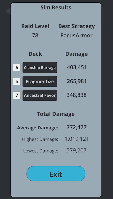 - OPEN SIM을 사용하면 플레이어 레이드 레벨, 데크 조합, 카드 레벨, 타이탄 헬스 및 전략을 수동으로 선택하여 엄청난 양의 시뮬레이션을 실행하여 예상되는 손상의 정확한 정리를 수행 할 수 있습니다. 모든 미리 코딩 된 전략에서 시뮬레이션을 실행하여 최상의 결과를 출력 할 수도 있습니다.