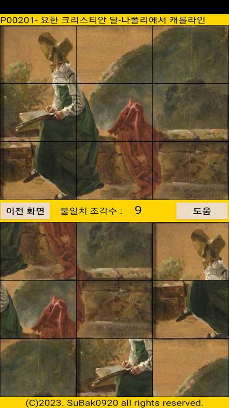 화면 1/2 상단의 원본과 같이 화면 1/2하단의 그림을 맞추어 가는 퍼즐 게입니다.