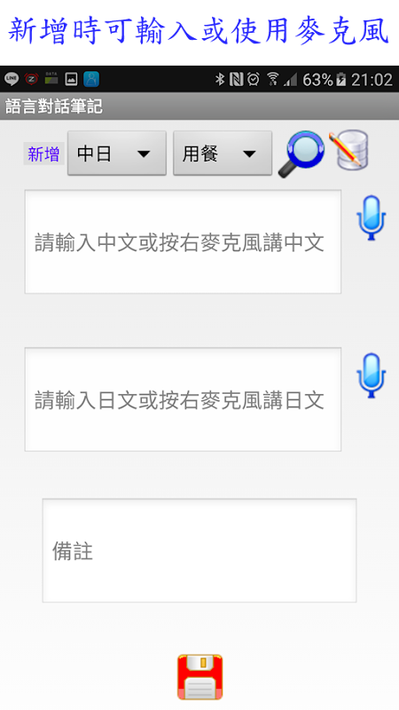 앱 언어 설정 대화 메모, 수정, 추가, 삭제합니다. 종류도, 수정, 삭제, 추가 할 수 있습니다 에서 대화의 총 일본어, 영어, 영어 - 일본어, 한국, 프랑스, 중국과 서양, 중국, 독일, 러시아, 의미 구. 그룹 또는 두 그룹 또는 모두 표시