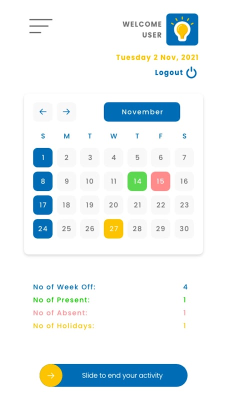 출석/결석 일수와 주간 휴무일에 대한 데이터시트를 보관하는 옵션도 있습니다. 체계적인 레이아웃입니다.