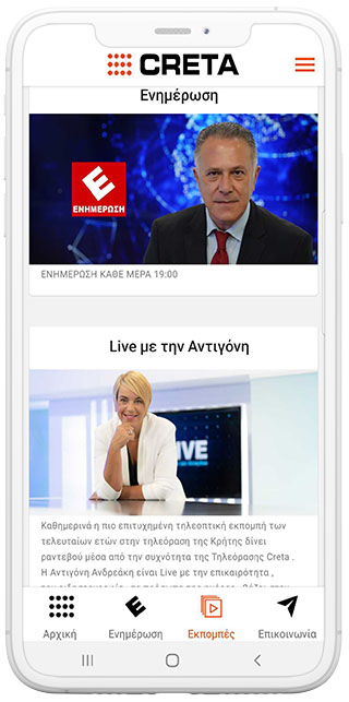 Android 및 iOS 기기 용 CRETA TV 애플리케이션은 방송국에서 좋아하는 모든 프로그램, 그리스 및 세계의 모든 최신 이벤트는 물론 어디서든 프로그램을 실시간으로 시청할 수있는 기능을 모바일 기기에 제공합니다.