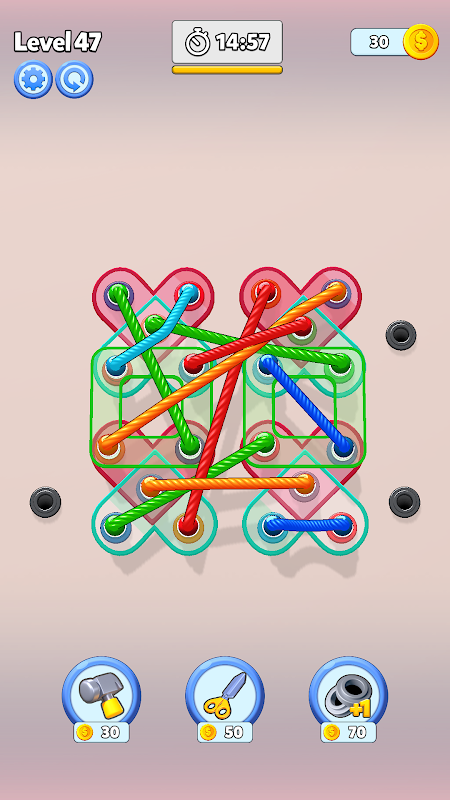 밧줄 풀기: 밧줄의 시작점과 끝점을 같은 색깔의 구멍에 연결하면 밧줄이 풀리고 퍼즐에서 제거됩니다.