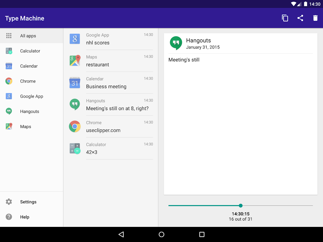Type Machine은 모든 앱에 입력하는 모든 내용을 저장합니다. 언제든지 열어서 오래된 항목을 찾으세요. 앱별로 필터링하세요. 기록 슬라이더를 드래그하여 입력한 내용을 한 글자씩 확인하세요. 복사하려면 탭하세요. 다시는 텍스트를 잃지 마세요!