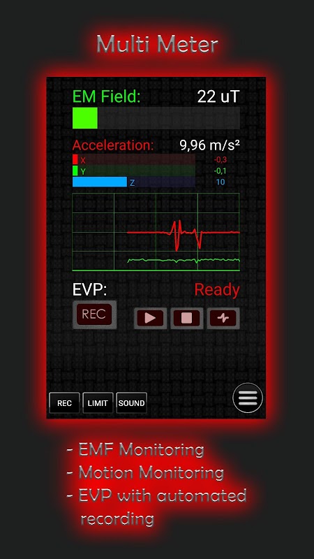 이 앱을 사용하면 장치 주변 자기장의 변화를 감지하고, 진동을 관찰 및 기록하고, 소리를 캡처하여 EVP를 분석할 수 있습니다. 이론적으로 이 데이터는 유령, 독립체, 초자연적 현상을 찾는 데 유용할 수 있습니다.