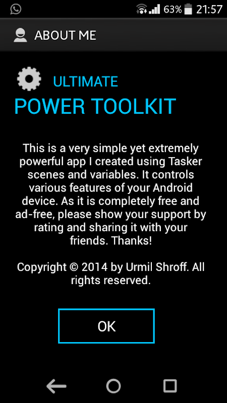 Ultimate Power Toolkit is a simple yet extremely powerful app I designed using Tasker scenes and variables. It can control various wireless settings, give accurate readings of magnetic strength, light level, temperature and altitude (if your device supports it). It also has the ability to reboot your device into various modes such as recovery and bootloader, and can kill the System UI and shut down your device in 2 seconds flat without the need of the power button. Besides all this, this small yet handy app can take a quick picture in one click and can also lock the screen with just one click.