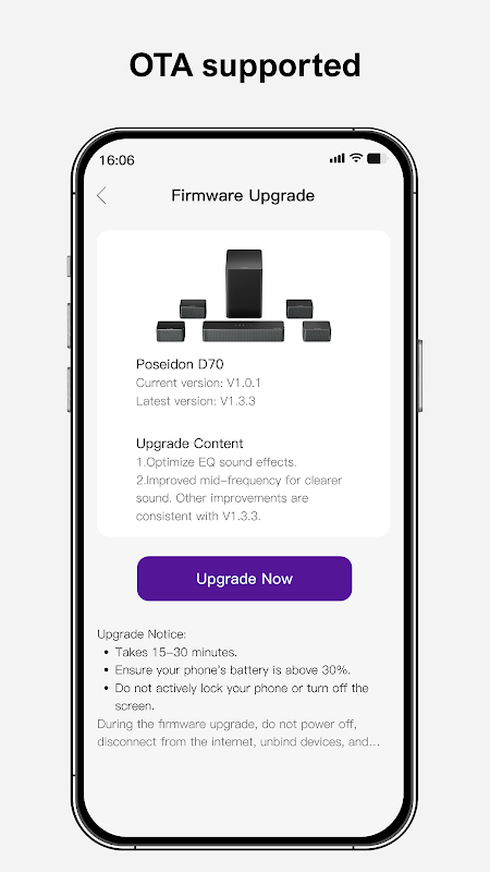 앱을 사용하여 사운드바를 빠르게 설정하고 스마트 컨트롤, 강력한 EQ 사용자 정의, 정밀한 장치 관리 및 맞춤형 사운드 경험을 위한 정기적인 OTA 업데이트를 통해 향상된 오디오를 즐겨보세요.