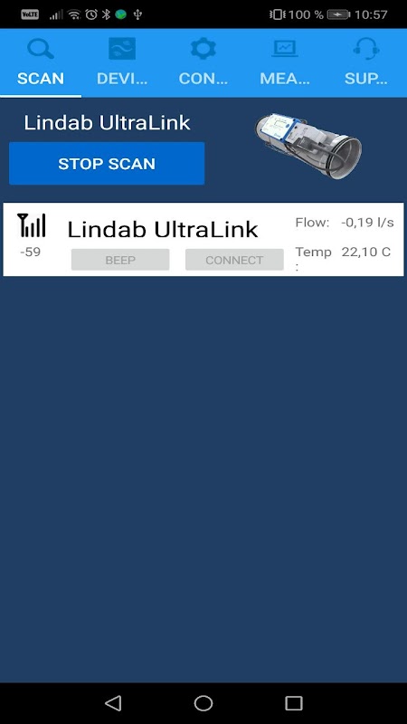 The app connects via Bluetooth to an UltraLink in ventilation ducts. Since the UltraLink is usually mounted in or near the ceiling, with the UltraLink app an installer can remotely change the settings of the flow meter from a distance, standing on the floor.