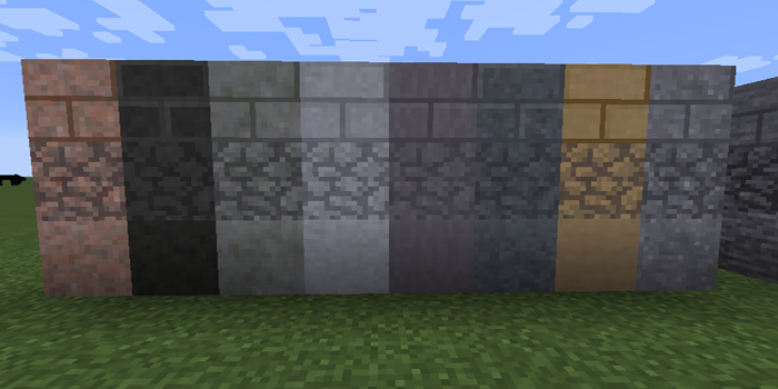 Mod adds 24 kinds of stone, 16 types of cobblestone Bricks Slabs Stairs Buttons