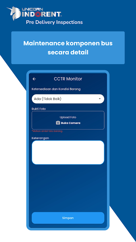 Unicorn PDI는 수리공이 Unicorn Indorent 버스를 보다 쉽게 관리할 수 있도록 지원합니다. 정비사가 유니콘 버스의 상태와 상태를 확인하고 기록할 수 있는 기능이 있어 버스의 품질과 유지보수를 극대화하여 운행할 수 있습니다.