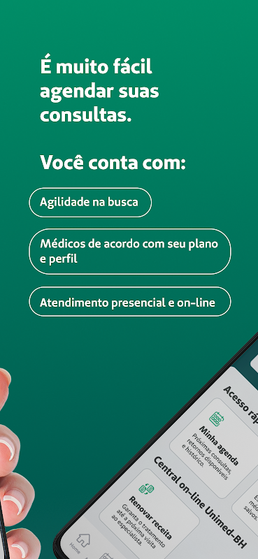 고객을 위한 Unimed-BH 앱은 약속 일정을 잡는 데 필요한 모든 것을 제공하고, 시험 및 절차 수행을 위한 위치와 가이드를 찾는 것은 물론, 재정 및 계정 관리에 대한 정보도 제공합니다.