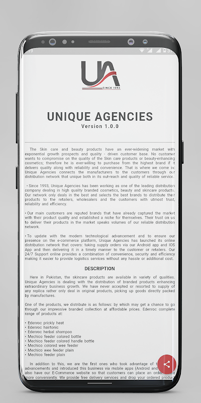 • 최신 기술 발전으로 업데이트하고 전자 상거래 플랫폼에서 우리의 존재를 보장하기 위해 Unique Agencies는 Android 앱 및 IOS 앱을 통해 공급 주문을받은 다음 적시에 제공하는 온라인 유통 네트워크를 시작했습니다. 고객 또는 소매 업체. 24/7 온라인 지원은 편리함, 보안 및 효율성의 조합을 제공하여 번거 로움이나 추가 비용없이 물류 서비스를 더 쉽게 제공 할 수 있습니다.