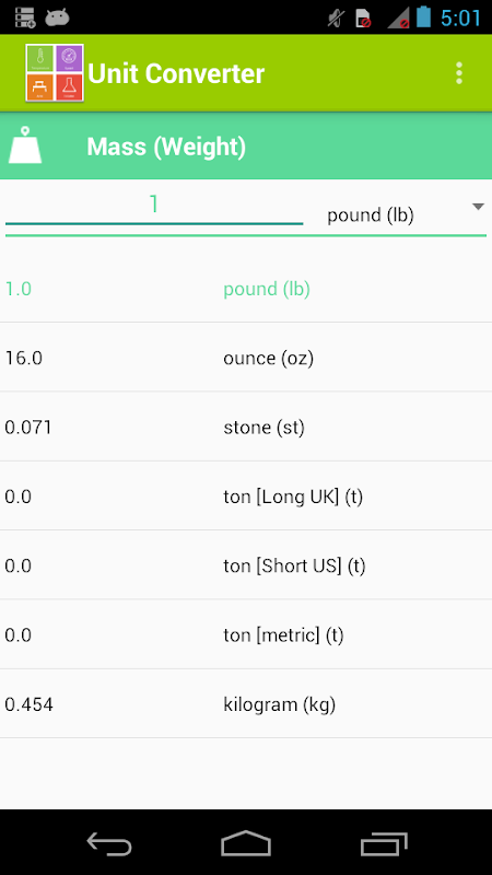 - Mass (Weight): (pound ,ounce ,stone ,ton [Long UK] ,ton [Short US] ,ton [metric] ,kilogram ,gram ,milligram ,grains)