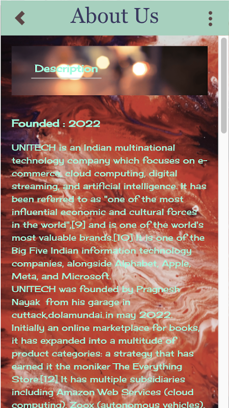 UNITECH is an Indian multinational technology company which focuses on e-commerce, cloud computing, digital streaming, and artificial intelligence. UNITECH was founded by Pragnesh Nayak from his garage in cuttack, dolamundai in may 2022. Initially an online marketplace for books, it is believed to expanded it into a multitude of product categories
