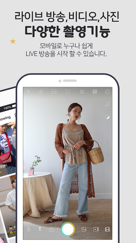 라이브 방송, 비디오, 사진, 설문, 구독 등 다양한 촬영 기능을 제공합니다. 모바일로 누구나 쉽게 LIVE 방송을 시작 할 수 있습니다. 또 다양한 레이아웃, 편집, 이펙트 기능을 이용하여 자신만의 VIDEO, GIF 등을 공유 할 수 있으며, 설문조사와 SUBCRIPTION COMMERCE를 위한 템플릿을 제공하고 있습니다.
