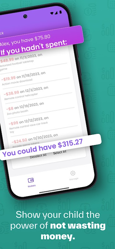 Unsquander는 돈을 낭비하는 아이들을 돈을 절약하는 아이들로 바꿔주는 깨끗하고 간단한 돈 추적기입니다. 어떻게? 이 앱은 아이들이 잊어버리거나 망가뜨린 모든 일에 돈을 쓰지 않았다면 지금 얼마나 많은 돈을 벌 수 있는지 정확하게 보여줍니다. 아이들은 일찍부터 "구매자의 후회"에 대한 교훈을 배우고, 머지않아 돈 낭비의 진정한 비용과 절약의 엄청난 힘에 대한 뿌리 깊은 이해를 발전시킵니다.