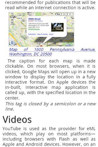 What's more, eML documents automatically adjust to the device on which they are viewed, so that they always look great, whether on Macs, PCs, iPods or iPhones, iPads, Windows Phones, or Android devices. And if you know how to write apps for these mobile platforms, eML publications can be dragged and dropped in a single operation, into an Xcode , Eclipse/ADK webview or MS Visual Studio Express WebBrowser, and they will automatically adjust themselves into native applications, which you can sell or give away in an online App store. All you have to do is choose how to display the app, and which features you'd like it to have.