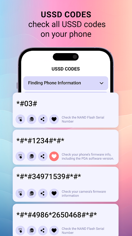 즐겨찾는 USSD 코드에 액세스, 복사, 공유 및 추가하고 모바일 정보 세부정보를 확인하세요.