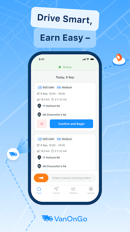 VanOnGo 드라이버 팀에 합류하여 간단하고 직관적인 앱을 통해 쉽게 배송을 관리하세요.