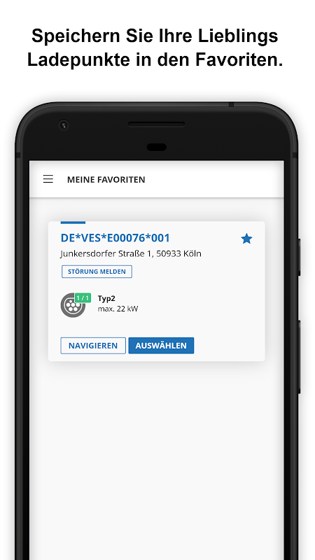 히스토리에서 전기 자동차를 이미 충전한 위치를 확인할 수 있습니다. 정기적으로 차를 몰고 가는 충전소가 있습니까? 그런 다음 쉽게 즐겨찾기로 표시하세요. 여행을 시작하기 전에 간단한 가용성 확인을 수행하십시오. 또는 전기 자동차를 충전할 수 있는 다른 사용 가능한 충전 지점을 선택하십시오.