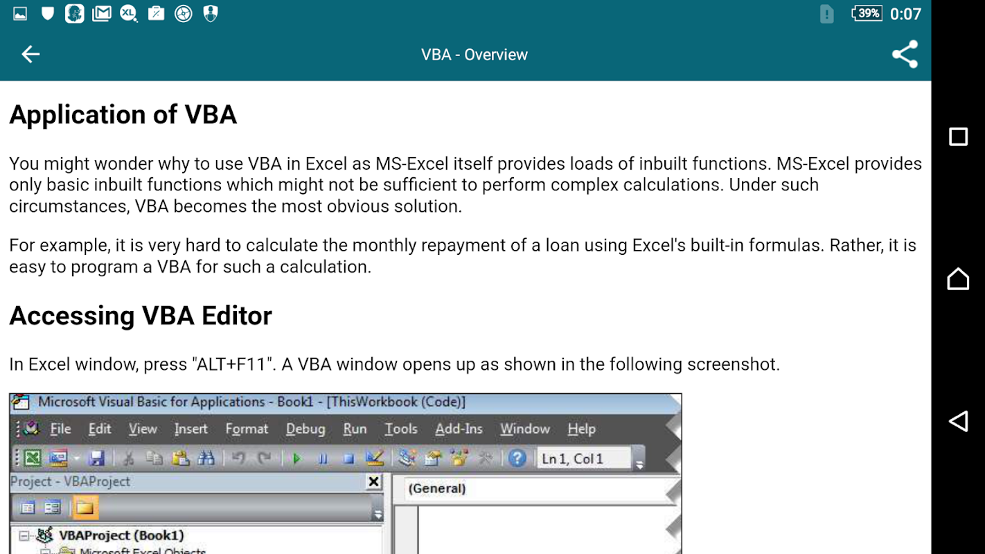 VBA stands for Visual Basic for Applications, an event-driven programming language from Microsoft. It is now predominantly used with Microsoft Office applications such as MSExcel, MS-Word and MS-Access. This tutorial teaches the basics of VBA. Each of the sections contain related topics with simple and useful examples.