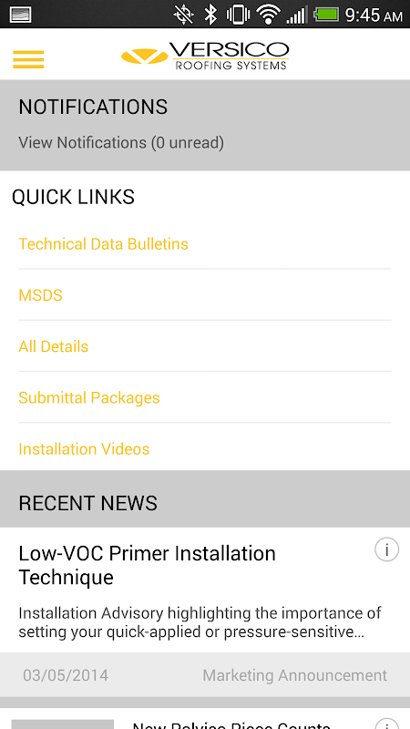 The new Versico Roofing Systems mobile app provides you with instant access to the news, content and installation information that you need. The app syncs seamlessly with your Versico Roofing Systems website profile, so you can access the resources you need from anywhere, at any time – all from your mobile device. Key features of the new Versico Roofing Systems App include: