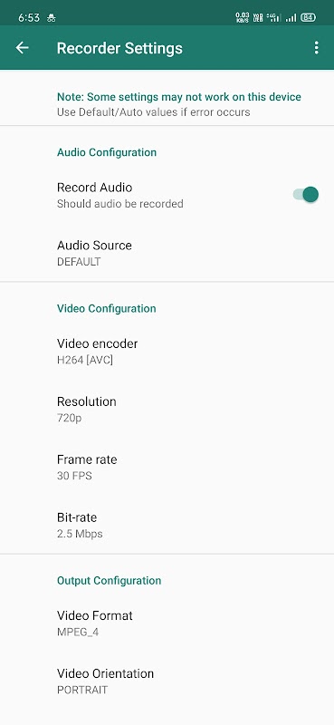 이 앱은 개발 단계에 있으므로 사용자 정의 설정이 작동하지 않으면 자동/기본 설정을 사용해 보세요. 귀하의 필요에 적합하고 귀하의 장치에서도 작동하는 비디오 인코더를 선택하십시오.