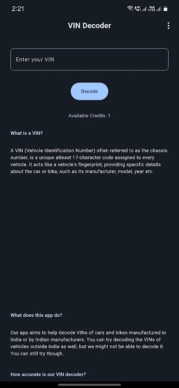 • 즉각적인 VIN 디코딩: 차량 식별 번호(VIN)를 입력하기만 하면 차량에 대한 자세한 정보에 액세스할 수 있습니다.