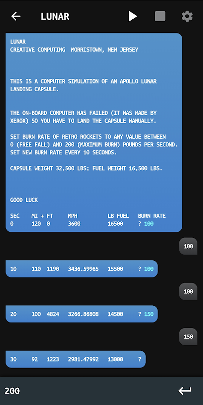 모든 프로그램은 40-50 년 전에 플레이 한 것처럼 간단한 문자 그래픽으로 텍스트 기반입니다. 플레이어는 키보드를 사용하여 채팅 스타일로 프로그램과 통신합니다. 질문에 답하거나 숫자 매개 변수를 입력하거나 다양한 옵션 중에서 선택하는 것일 수 있습니다.