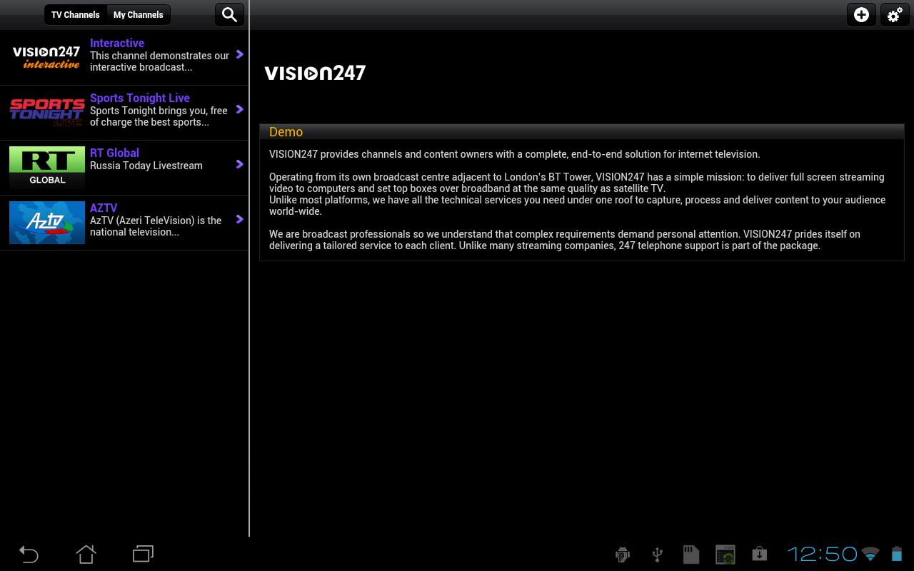 This is Vision247’s Player demonstration app. It shows how we deliver live channels, interactive channels and VoD within a client’s branded user interface. All content is controlled through our cloud-based content management system and streamed to the viewer over our powerful content distribution network.