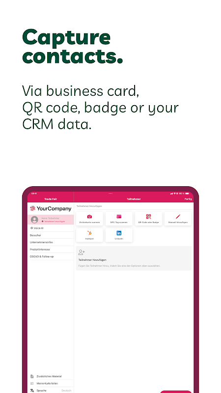 박람회, 회의 또는 현장에서 실시간으로 리드를 확보하세요. SnapAddy의 VisitReport는 연락처 수집 프로세스를 디지털화하여 명함, QR 코드, 박람회 배지, NFC 태그 또는 CRM 템플릿을 스캔하고 CRM에 깔끔하게 저장할 수 있도록 지원합니다.