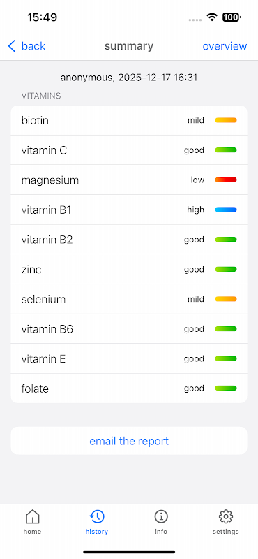 측정 과정을 단계별로 안내하며, 전반적인 영양소 섭취 추이가 낮음, 높음 또는 적정 수준인지 명확하게 보여줍니다. 측정값은 안전하게 저장되므로 언제든지 개인별 섭취 추이와 기록을 확인할 수 있습니다. 이 앱은 집에서든 이동 중이든 언제 어디서나 간편하게 사용할 수 있도록 설계되었습니다.